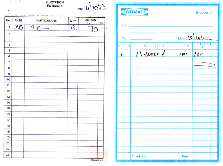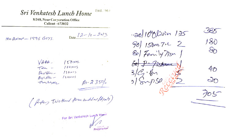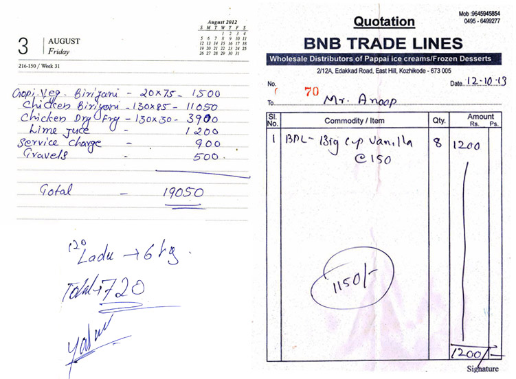 | 1 | Gobi Veg Biriyani (Rs.75*20) | 1500 |