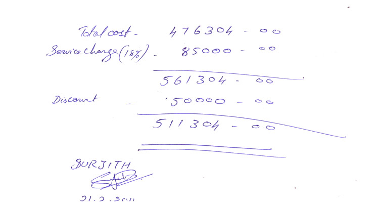 | 6 | Service charge for Contractor (18% of Construction, Carpentry & Electrical costs = Rs.4,76,304/-) | 85000 |