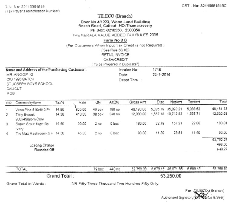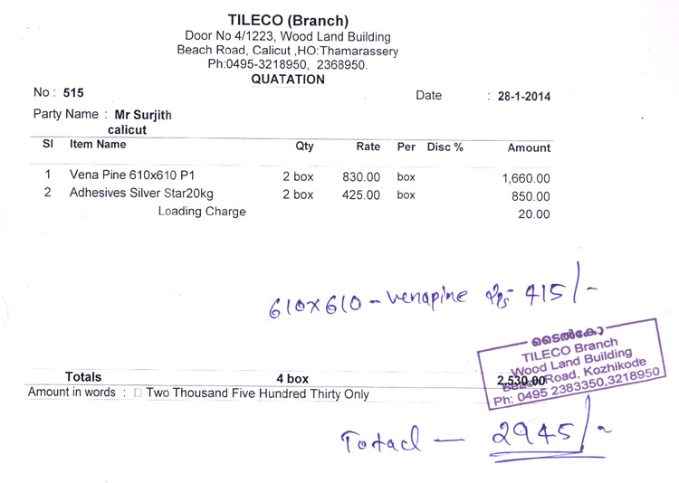 | 1 | Floor Tiles (Somany Vena Pine - 824 sq ft including wastage) | 42256 |