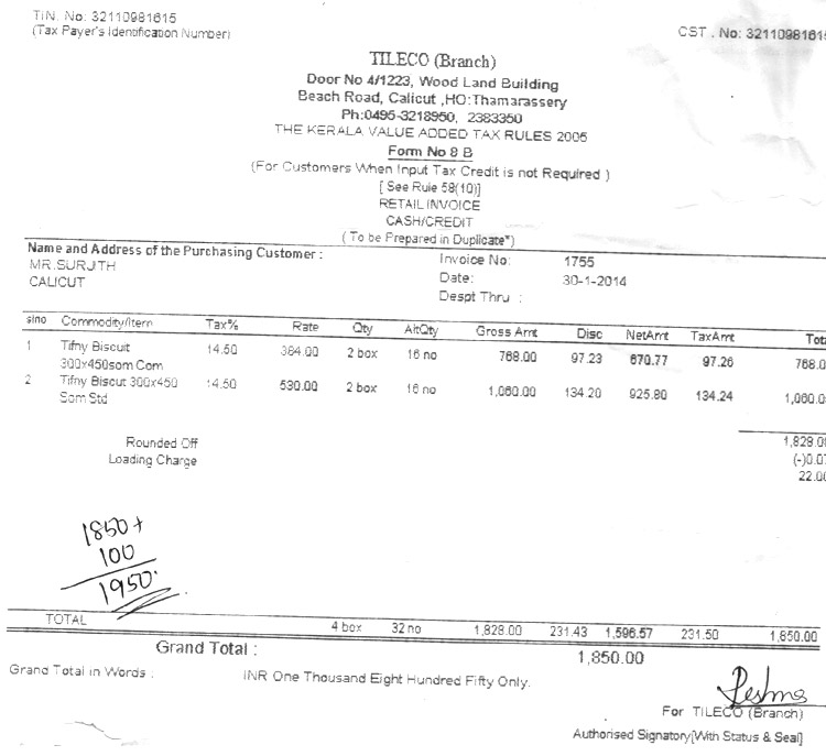 | 2 | Wall Tiles (Tifny Biscuit - 408 sq ft including wastage) | 14128 |
