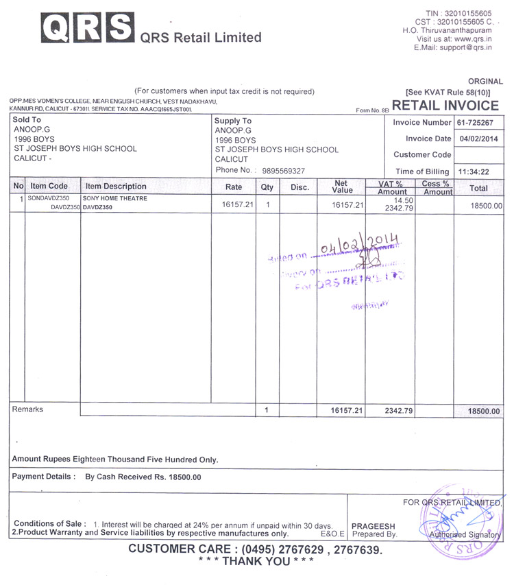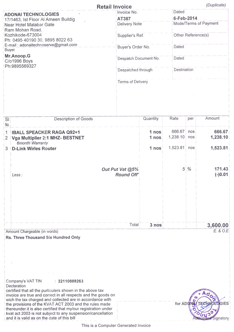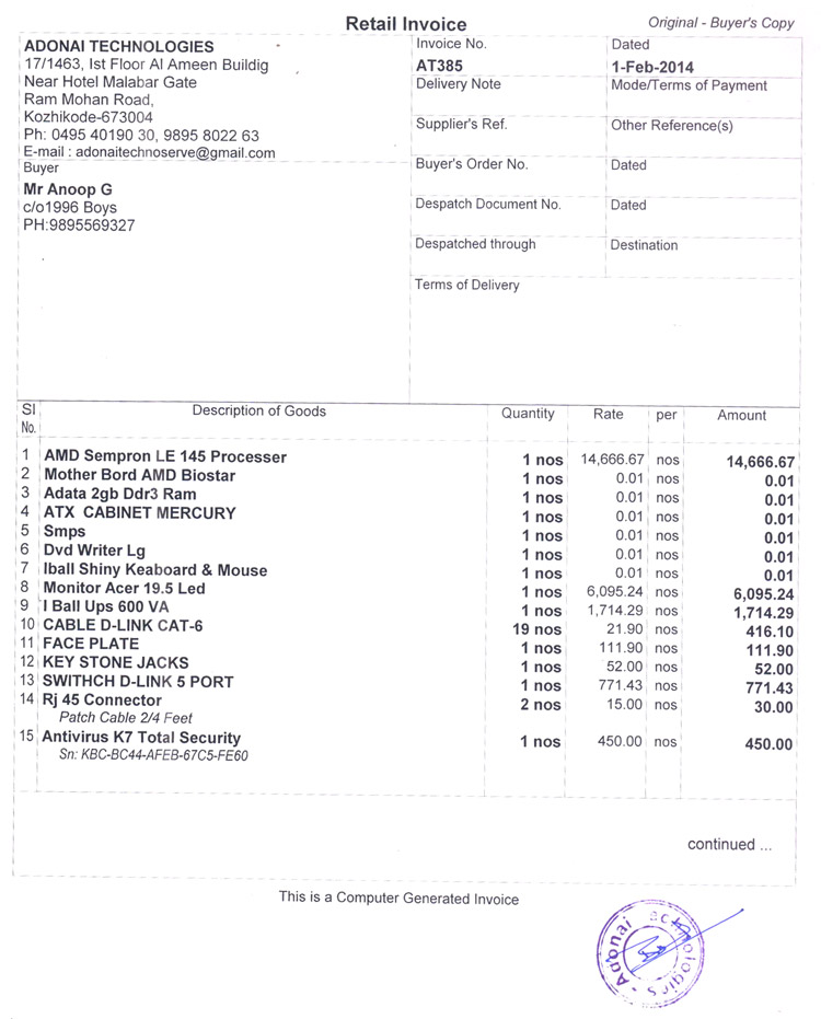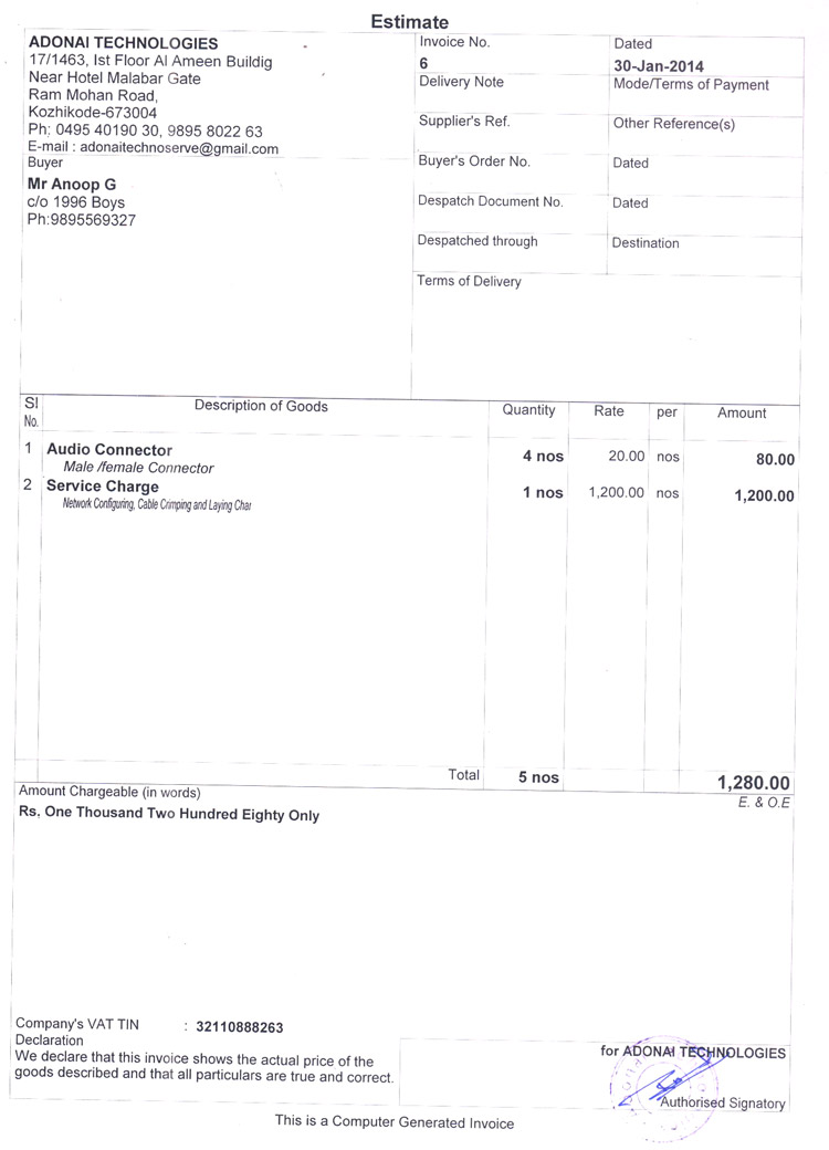 | 11 | Service Charge for Network configuring & others | 1200 |