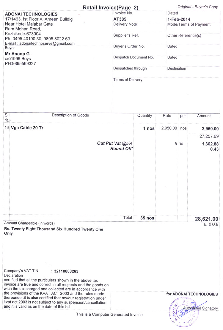 | 7 | VGA Cable to connect Computer with Projector (20 mts) | 3098 |