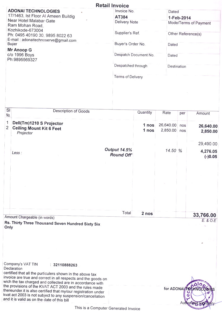 | 2 | 19.5'' LED Monitor (Acer) | 6400 |