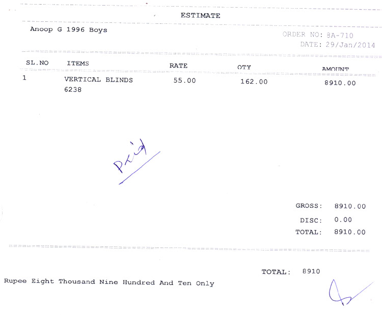 | 13 | Vertical Blinds (162 sq.ft @ Rs.55/sq.ft) | 8910 |