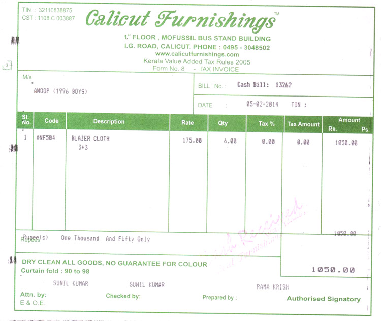 | 14 | Blazer Cloth for the table top (6 mts) | 1050 |